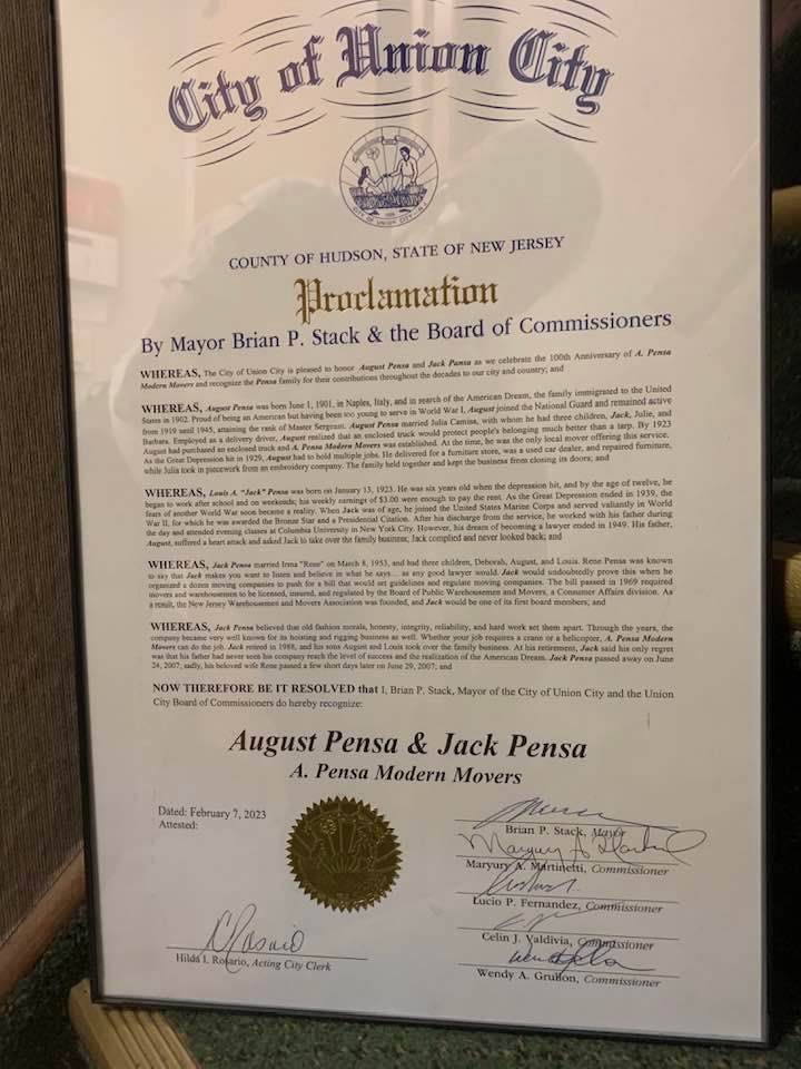 Our website reads AN AMERICAN DREAM.. STILL ON THE MOVE!! Well today the dream came true!! Unofficially on July 12, 1923, August, PENSA took an old truck, painted green and gold and named his company A.PENSA MODERN MOVERS. 100 years later, today, mayor, Brian Stack, and the commissioners, and all the public officials in Union City and Hudson County helped us celebrate our 100th year in business by renaming, 12th St, and Kennedy Boulevard in honor of our family and our company.. I don’t think my grandparents or parents could’ve ever dreamed that the small, moving company they started and built could’ve reached this mile stone and success. I’m so humbled, honored, and thankful to everybody, who helped us along the many many years to get here. From the hundreds and hundreds of great men that have worn thePensa uniform to the thousands and thousands of customers that it’s been our pleasure to work with and now “friends. Augie and I have put over 45 years into doing with our parents instilled in us… Which is hard work, integrity, reliability and try to help each and every person you move make that they just a little bit easier than they thought! Again from the entire PENSA family to Lily at public affairs, my friend and mayor Brian Stack, and all who attend it today I want to thank you from the bottom of my heart! You made those 47 years of hard work all worth it today!!! And yes, if you work hard, care about your customers and don’t settle for being good… But I always try to be the best. Your American dream will come true!! Again a heartfelt thanks, and God bless all of you and your families!!